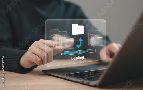 A person uploads or downloads files using laptop with a loading bar and folders on the digital interface.
