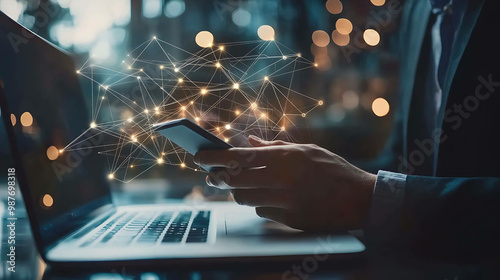 A person uses a phone and laptop, with a network of connections digitally represented above.
