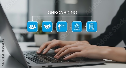 A person using a laptop, focused on onboarding process, with various icons representing different stages of employee onboarding.