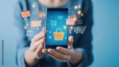 A person using a smartphone displays shopping icons, highlighting modern digital shopping trends and online commerce innovation.