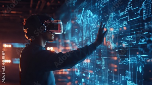 A person using virtual reality headset interacts with a futuristic digital interface displaying various data and technological elements.