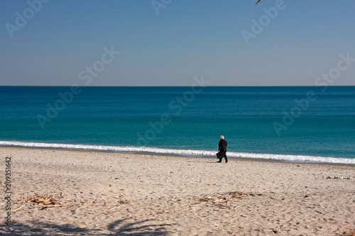 A person walks by the sea on a deserted beach
