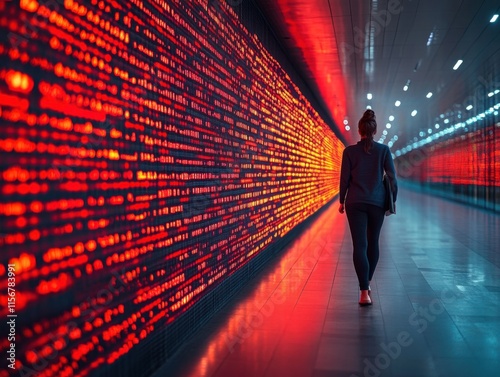 A person walks down a corridor filled with glowing red binary code, symbolizing cybersecurity and data protection in a digital world.