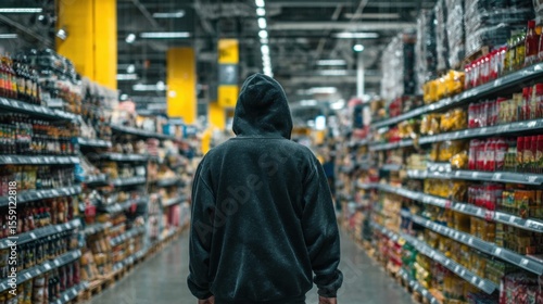 A person wearing a dark hoodie stands in the middle of a grocery store aisle, surrounded by various food products and shelves filled with items.
