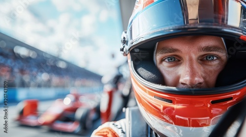A person wearing a helmet prepares at a racing event, standing in the pit area as race cars can be seen in the background, epitomizing the intense preparation before a race.