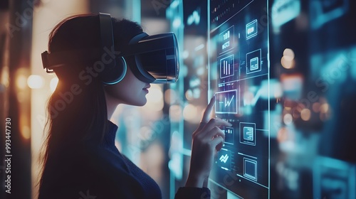 A person wearing a virtual reality headset, interacting with a holographic interface displaying digital wallet options and transaction details in a futuristic virtual environment, symbolizing