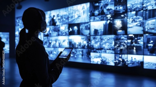 A person wearing headphones monitors multiple digital screens, holding a tablet in a dimly lit, high-tech control room.