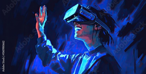 A person wearing VR glasses, standing sideways with hands raised to touch the screen in front of them, side view, pure black background, cool neon light effect, glitch art style