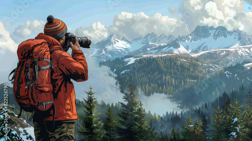 a person with camera in hand, standing on the top of the mountain and enjoying the view of the valley.
