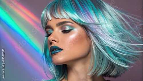 A person with mediumlength hair showcases a bold holographic look with bright teal and silver shades that dynamically change with every slight movement. Their lips coated in