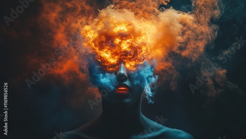 A person with their head exploding in an orange and blue explosion of smoke, symbolizing the intense emotions that can form within someone's mind.