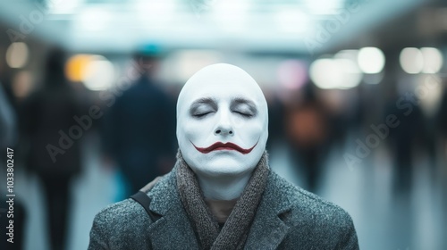 A person with white clown makeup and red lips stands with eyes closed against a backdrop of blurred city commuters, evoking solitude amidst urban chaos.