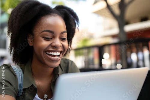 a person working remotely on laptop and having a video call while sitting outside