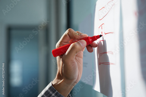 A person writing on a whiteboard with a red marker in a bright office space
