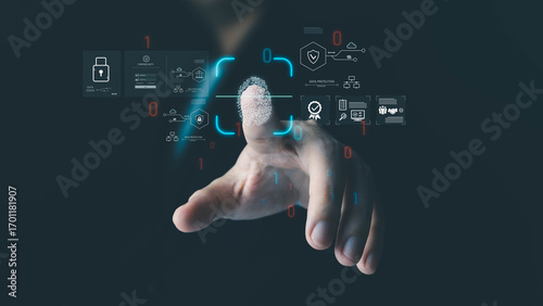 A person's finger scans a futuristic digital interface, unlocking data with biometric authentication. This concept illustrates cybersecurity and information protection technology.