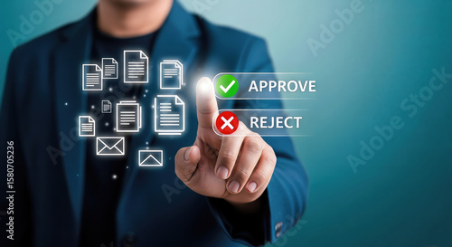 A persons finger selects approve on a digital interface displaying document icons and decision options, signifying a positive outcome