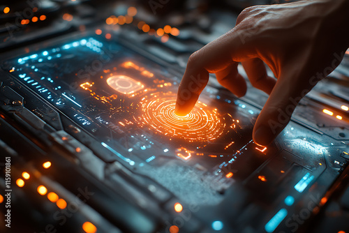 A person’s hand hovering over a glowing biometric scanner with futuristic holographic displays showing authentication progress