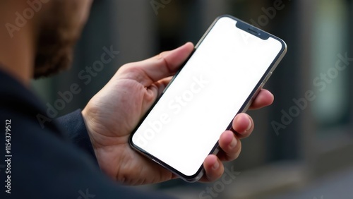 A person's hand is holding a smartphone with a blank white screen, with an out-of-focus background. Concept of: Mobile technology and screen customization. Smartphone Screen Mockup