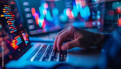 A person"s hand typing on a laptop keyboard, surrounded by colorful data visualizations and graphs, highlighting a tech-focused environment.