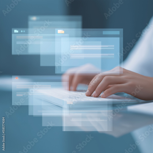 A person's hands are seen typing on a white keyboard, with multiple transparent, overlapping digital interface windows floating in front, illustrating concepts of multitasking, data entry