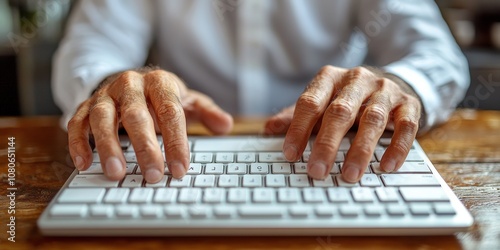 A person's hands are typing on a modern white computer keyboard, showcasing an office or work environment, likely focused on business or technology tasks