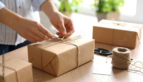 A person's hands carefully tie natural twine around a package wrapped in brown paper on a table.