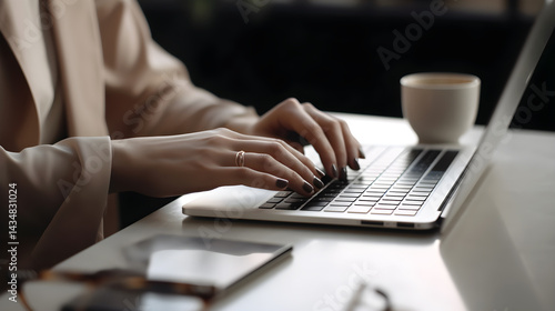 A person's hands typing on a laptop keyboard with a cup of coffee on a table.