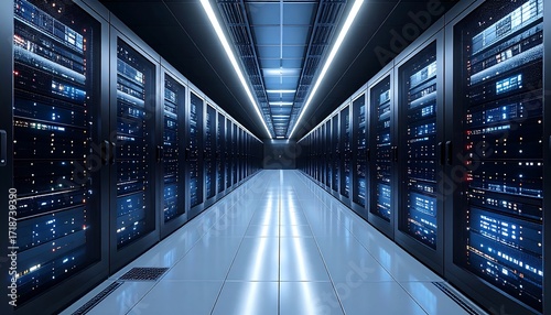 A perspective shot of a long server room hallway filled with glowing blue server racks, illuminated by bright overhead lights. The floor is tiled