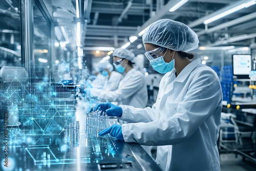 A pharmaceutical production line with workers in lab coats and masks meticulously processing glass medical vials, emphasizing precision and safety in a sterile environment