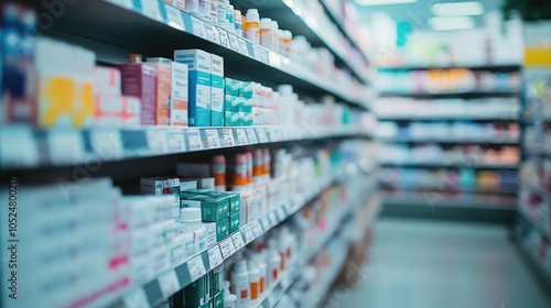 A pharmacy aisle filled with various medications and health products on display.