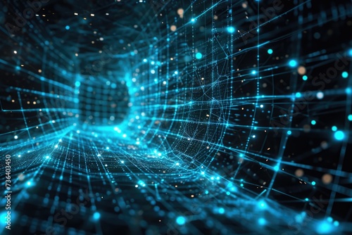 A photo featuring a blue and black background adorned with lines and dots, creating a visually striking pattern, An encrypted message travelling through a network, AI Generated