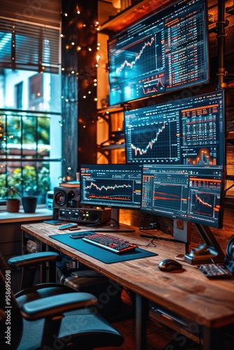 A photo of a crypto investor's home office, with multiple screens displaying live market data and trends