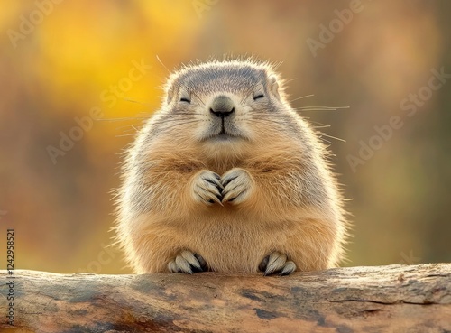 A photo of an obese groundhog with its head down, sitting on the edge of a log in nature.