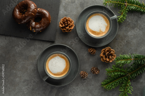 A photo of cappuccino with chocolate donuts and christmas decoration. Grey cups on the grey table and a grey wall. Place for text