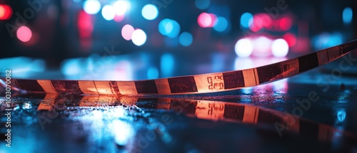 A photo police tape, with a blurred background and crime scene lines in the foreground