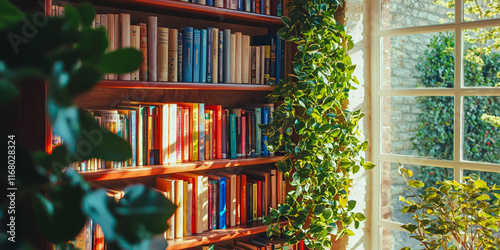A photograph of an elegant bookshelf filled with colorful books, generative AI