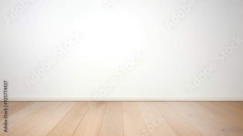 A photograph of an empty white wall with light wood flooring, background, backdrop
