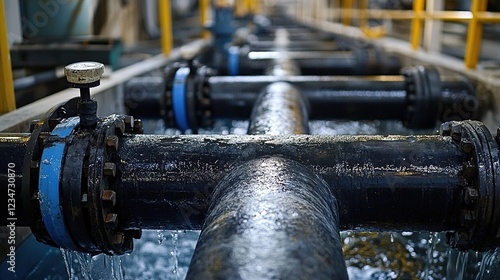 A photograph of an industrial water system with large black and blue pipes, showcasing the flow path from left to right in close-up