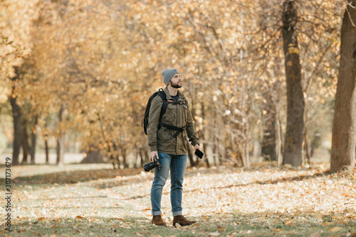 A photographer with a beard in olive military cargo combat jacket, jeans, hat with backpack and wristwatch holds the DSLR camera, the smartphone and waits in the forest at the noon.