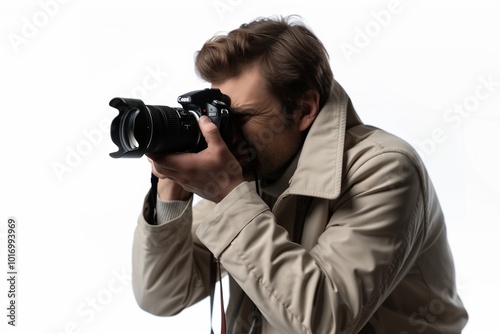 A photographer with a camera, capturing a moment with intense concentration, cut out against a white background.