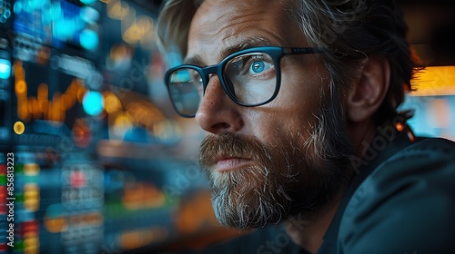 A photographic style of a financial analyst examining stock market trends on a large monitor, high-tech modern office, balanced lighting, serious expression, ergonomic setup.