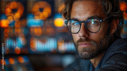 A photographic style of a financial analyst multi-tasking with multiple devices and financial reports, high-tech modern office, balanced lighting, serious expression, financial reports on desk, financ