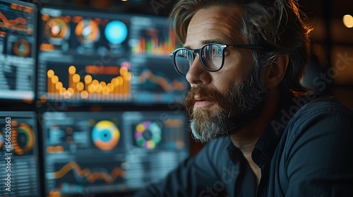 A photographic style of a financial analyst reviewing interactive charts and graphs on a large computer screen, high-tech modern office, balanced lighting, serious expression, ergonomic setup.