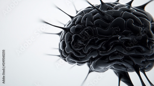 A photorealistic close-up of a glossy black brain, its surface covered in intricate reflective
