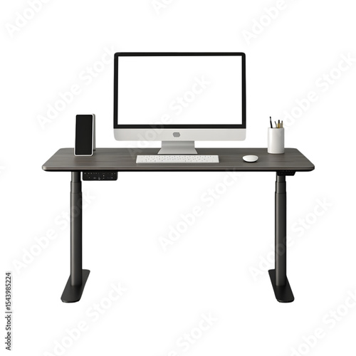 A photorealistic depiction of a functional Computer Desk featuring sleek edges, modern materials, and ergonomic considerations, isolated on transparent background