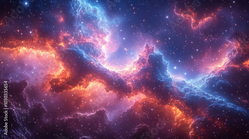 A photorealistic image of space with bright purple and pink clouds and stars. A breathtaking view of cosmic space with nebulas and starlight