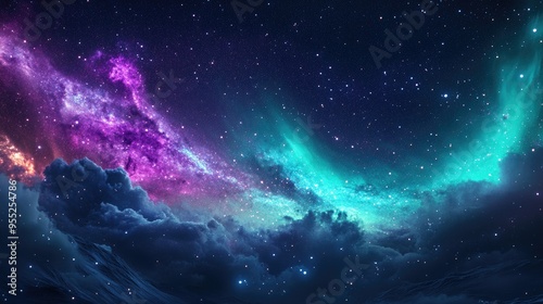 A photorealistic image of the Milky Way galaxy and the aurora borealis, with intricate details and vibrant colors.