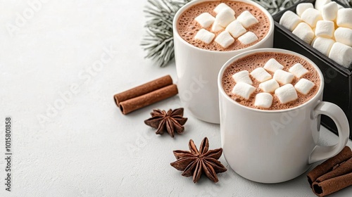 A photostock image of hot chocolate with marshmallows served in white mugs on a clean white background