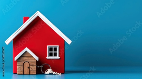 A photostock of a house keychain with small wooden house attached on isolated on transparent PNG background, High Quality.