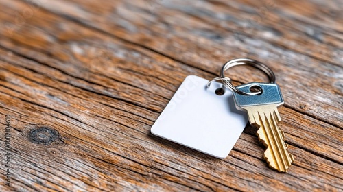 A photostock of a modern silver house key on a keyring with a blank tag on isolated on transparent PNG background, High Quality.